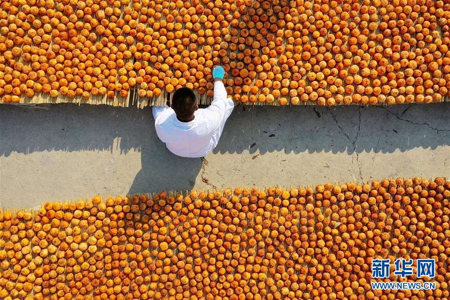 11月4日,河北省遵化市地北头镇前山屯村的村民在晾晒柿饼(无人机照片)。 深秋时节,河北省遵化市地北头镇农民忙着将柿子去皮,用传统晾晒工艺制成柿饼,供应市场保增收。 新华社记者 邢广利 摄