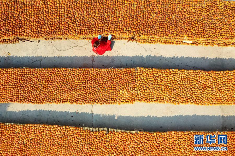 11月4日,河北省遵化市地北头镇前山屯村的村民在晾晒柿饼(无人机照片)。 深秋时节,河北省遵化市地北头镇农民忙着将柿子去皮,用传统晾晒工艺制成柿饼,供应市场保增收。 新华社记者 邢广利 摄