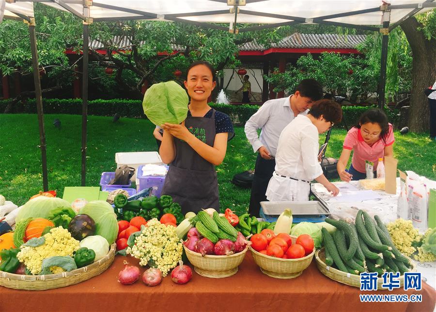 石嫣在北京市香格里拉酒店农夫市集销售和推广农场产品(2019年6月19日摄)。新华社发