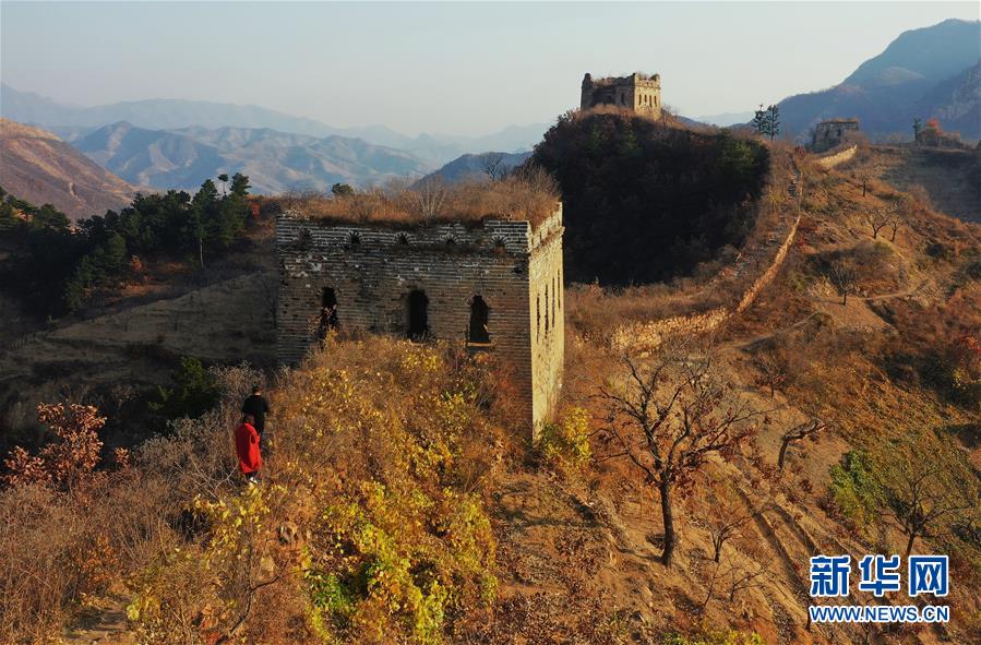 11月4日,游客在迁西县金厂峪镇境内的榆木岭长城观光(无人机照片)。 深秋时节,位于河北省迁西县金厂峪镇境内的榆木岭长城风景如画。 新华社记者杨世尧摄