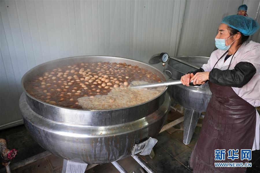 11月4日,在延安劳山鸡业有限责任公司,工作人员在制作卤鸡蛋。 延安劳山鸡业有限责任公司位于陕西省延安市甘泉县劳山乡劳山村,是集养殖、蛋品加工等为一体的企业。该公司从2012年起配合县残联开展扶残助残活动,吸纳残疾人就业,通过培训提高残疾人养殖技术,让残疾人养殖户自食其力逐步增收。 新华社记者 才扬 摄