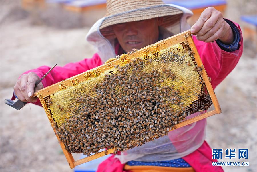 11月4日,在延安市宝塔区李渠镇新庄科村,蜂农汪占柱展示养殖的蜜蜂。汪占柱今年45岁,肢体残疾,现养殖蜜蜂50箱,养蜂年收入2万多元。 2017年以来,陕西省延安市宝塔区残联立足区域自然条件,结合残疾人实际情况,把养蜂作为脱贫攻坚的突破口,积极探索残疾人养蜂的“甜蜜”事业,现已发展蜂农100户,蜂群存栏近2000群。 新华社记者 才扬 摄