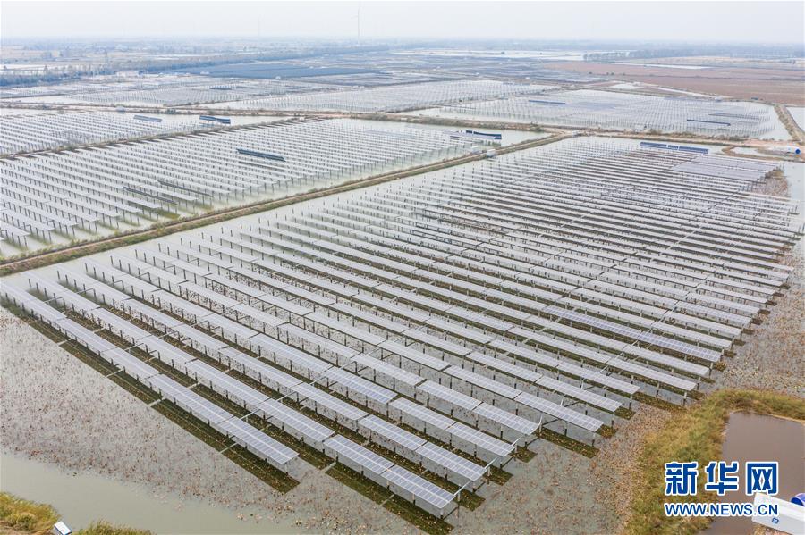 这是11月5日拍摄的江苏省扬州市宝应县射阳湖镇“渔光互补”光伏发电项目(无人机照片)。 近年来,江苏省扬州市宝应县大力发展生态循环农业,将原先一些荒滩、低洼地开发建设为生态渔业“渔光互补”光伏电站,在发展绿色新能源的同时,推进当地乡村振兴。 据介绍,目前宝应县“渔光互补”光伏电站面积达6万多亩,已并网的渔光互补项目17个,并网容量712兆瓦。 新华社记者 李博 摄