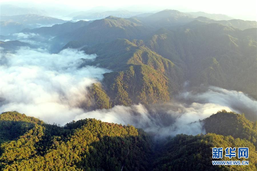 这是在福建省连城县莒溪镇太平僚村拍摄的梅花山自然保护区森林景观(11月5日摄,无人机照片)。 梅花山自然保护区位于闽西上杭、连城、新罗三县(区)交界处,平均海拔900米,总面积220余平方公里,森林覆盖率达93.5%,犹如一颗绿色翡翠镶嵌在闽西大地上。 新华社记者 彭张青 摄