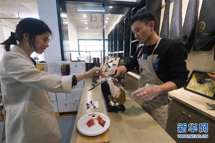 11月5日,顾客在青田一家进口商品超市内品尝一款西班牙进口火腿。 近期,浙江省丽水市青田县进口商品城的进口商迎来年末销售旺季,他们通过线上和线下等多渠道销售红酒、食品、百货等进口商品。 近年来,青田县充分发挥华侨资源优势,大力扶持进口商贸服务业,积极推动进口商品城建设,培育侨乡经济发展新引擎。进口商品城陆续建成营业4个市场和1个世界红酒中心,总营业面积9万平方米,销售额累计突破80亿元,有效带动青田进口商贸业快速发展。 新华社记者 徐昱 摄