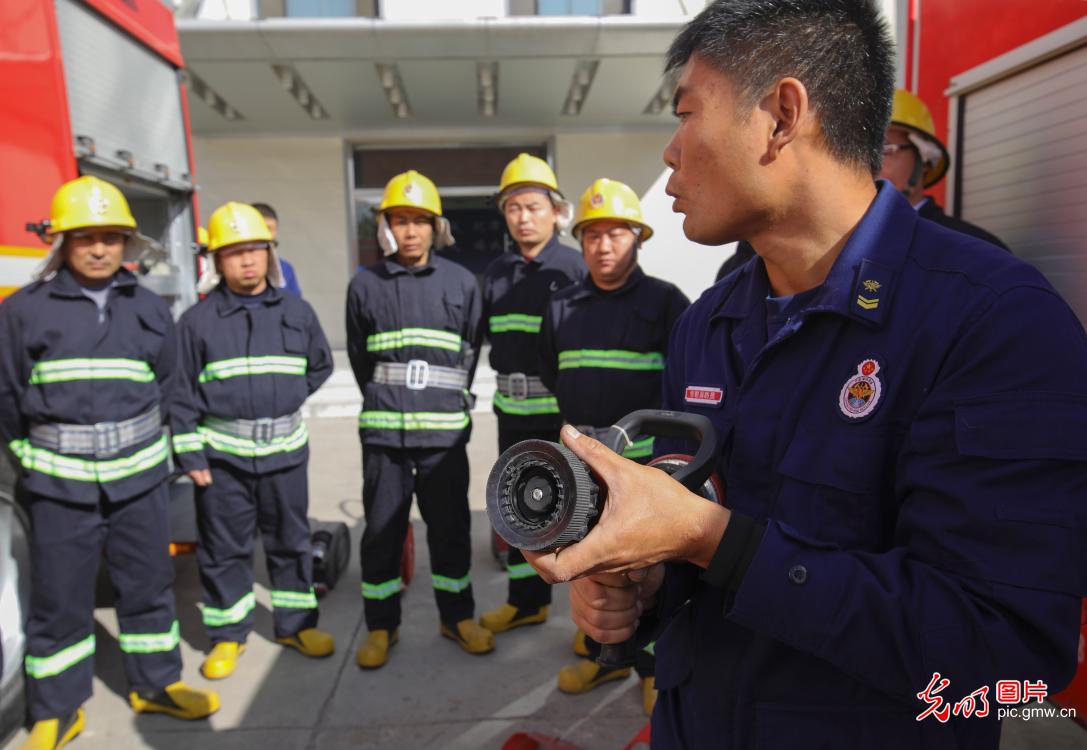 2020年11月3日,山东省临沂市兰山区枣园镇消防站,专业人员(右一)正在教授消防志愿者水枪持握技能。全国消防日前夕,当地组织全镇消防志愿者及车辆在镇消防站专业人员的指导下开展消防技能培训、灭火演练、紧急拉动等"联勤联动"消防日活动,提高消防志愿者队伍的专业技能和机动能力。(许传宝摄/光明图片)