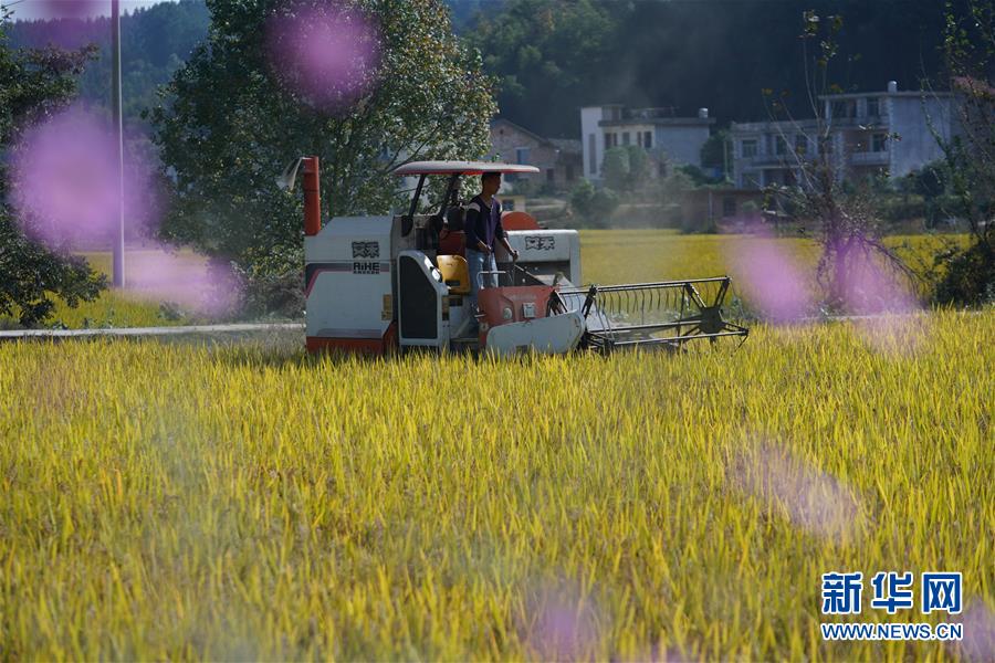 在江西省宜春市万载县双桥镇清城村,农户驾驶收割机收割水稻(11月5日摄)。 近日,位于江西省宜春市万载县的高产稻田加紧收获。据介绍,万载县白良镇、双桥镇采用测土配方施肥、综合防治病虫草害等技术,选用优良品种,对两个乡镇共3700亩水稻田进行科学管理,实现平均亩产超900公斤。 新华社记者 周密 摄