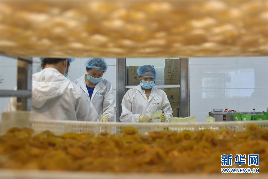 工作人员在廖家桥镇的周生堂生物科技有限公司包装猕猴桃果脯。这家公司在收购菖蒲塘村的水果后进行深加工,提升水果产品附加值(8月19日摄)。 湖南凤凰县廖家桥镇菖蒲塘村是一个土家族村落,曾是一个贫困村。近年来,当地大力发展水果产业,种植猕猴桃、柚子、柑橘、葡萄,还依托水果种植发展水果加工、育苗、旅游等产业,依靠电商平台扩大销售市场。依靠“甜蜜”的水果事业,菖蒲塘村2016年实现整村脱贫,村民们过上了甜滋滋的日子。 新华社记者 丁春雨 摄