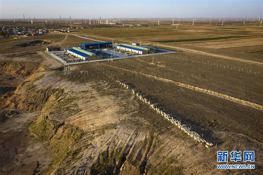 在盐池县大水坑镇宋堡子村生态牧场,工作人员驱赶滩羊在跑道上“锻炼”,以提高肉质品质(11月2日摄,无人机照片)。