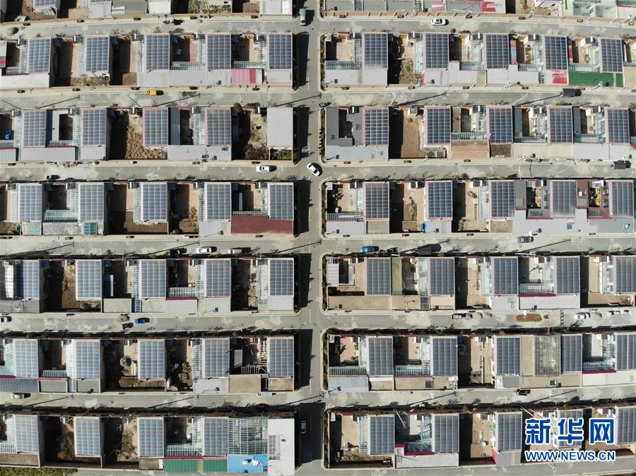 这是11月6日拍摄的班彦新村装有太阳能发电板的民房(无人机照片)。 青海省海东市互助土族自治县属于六盘山集中连片特困地区。行路难、用水难、上学难,是互助县五十镇班彦村百姓多年来的心病。四年前,受益于易地扶贫搬迁政策,村民们整体搬迁到山下统一规划、统一建设的新村。这里水、电、天然气等一应俱全,太阳能路灯一字排开,房屋错落有致,塑胶篮球场、休闲广场、栈道花园等点缀其间。村口还建起了生产土族盘绣的扶贫车间,人们唱着“花儿”,在盘绣中绣着花儿,幸福的生活就像花儿一样。 新华社记者 戴天放 摄
