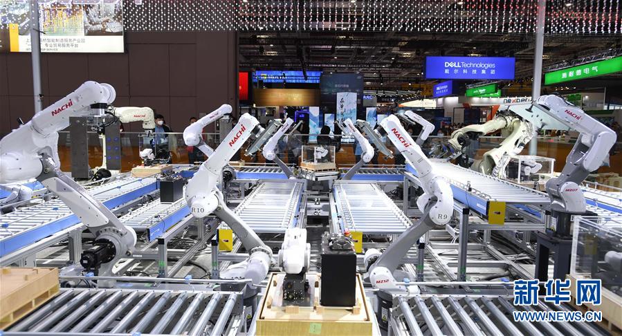 11月5日在技术装备展区不二越展台拍摄的NACHI工业机器人。不二越已连续三年参加进博会。新华社记者 李任滋 摄