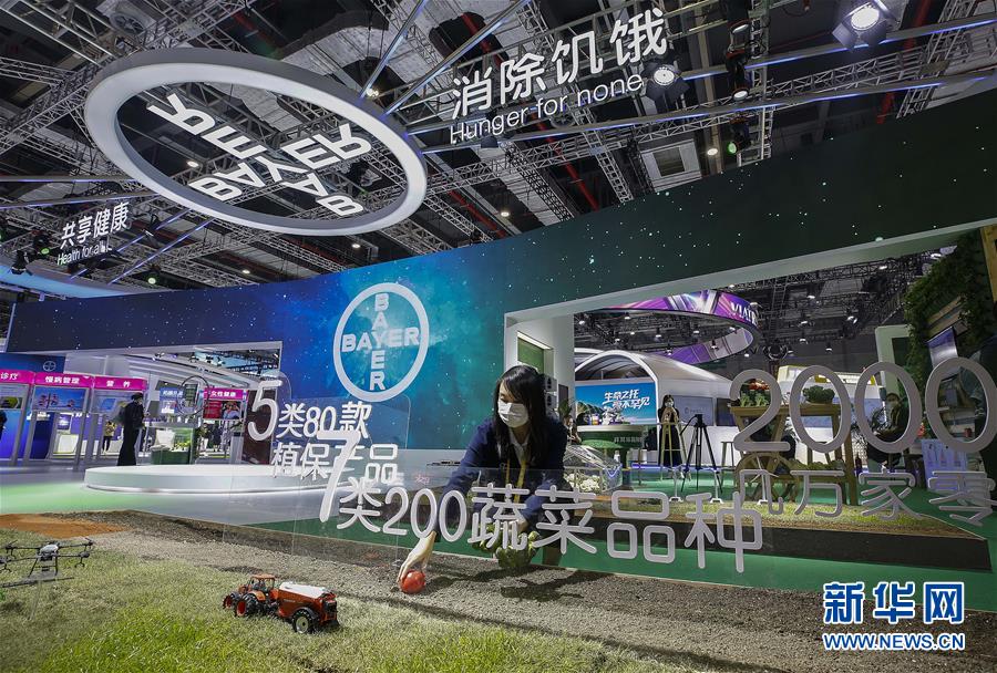 11月7日,工作人员在医疗器械及医药保健展区的拜耳展台摆放展品。拜耳已连续三年参加进博会。新华社记者 张玉薇 摄