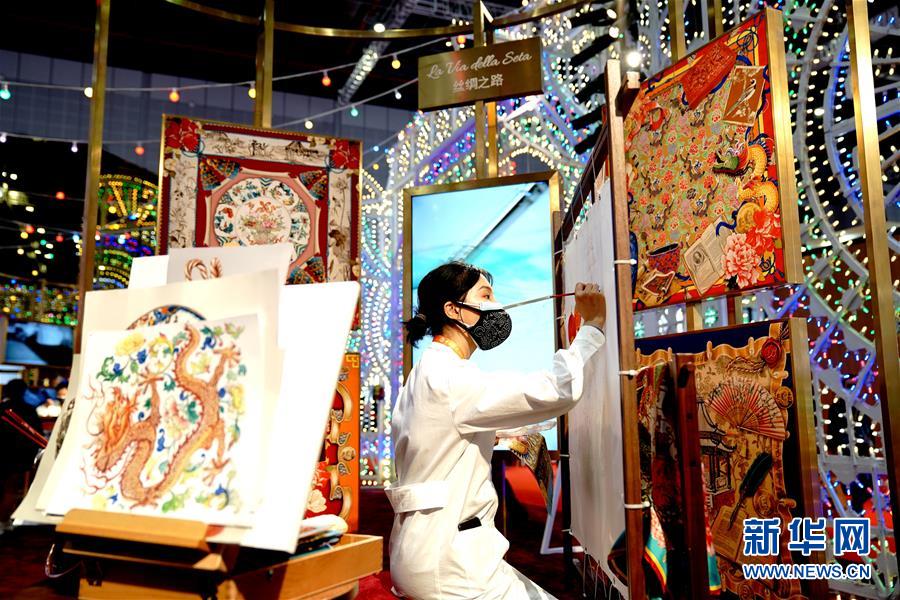 11月7日,一名绘画者在消费品展区手绘丝绸图样。 第三届中国国际进口博览会的消费品展区面积9万平方米,展区汇集各种“酷”科技与“最”潮流,展现了人们对美好生活的期待,受到参观者青睐。 新华社记者 张建松 摄