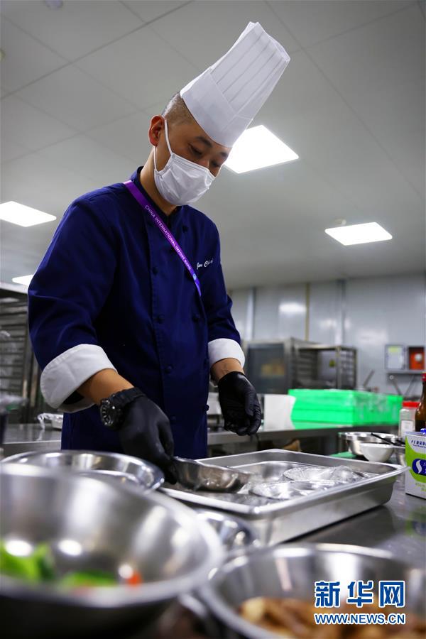 11月5日,一名厨师在厨房准备饭菜。 第三届中国国际进口博览会正在上海举行。展会工作人员和保障人员在举办地国家会展中心(上海)坚守岗位,确保各项环节顺利进行。多才多艺的进博会志愿者“小叶子”、手艺精湛的食堂大厨、细心周到的穿梭巴士司机……身居幕后、无私奉献的保障团队,组成了进博会一条靓丽的风景线。 新华社记者 卢烨 摄
