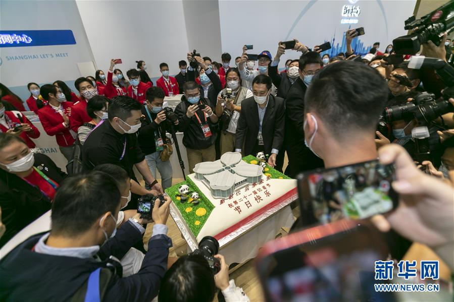 11月8日,媒体记者在进博会新闻中心拍摄庆祝记者节的蛋糕。新华社记者 王翔 摄