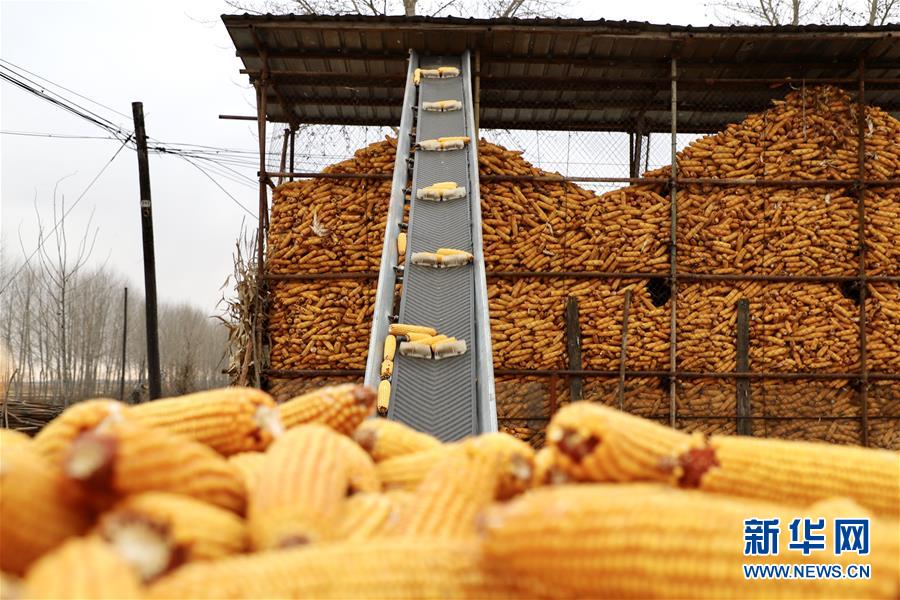 在哈尔滨市巴彦港镇五星村程显义家院内,玉米通过传送带进入玉米架子(11月3日摄)。 新华社记者 徐凯鑫 摄