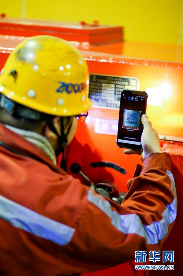 11月4日,在地下400米的采煤工作面,国源矿业公司的一名矿工在使用手机软件读取采煤机械的运行参数。 新华社发(马世超 摄)