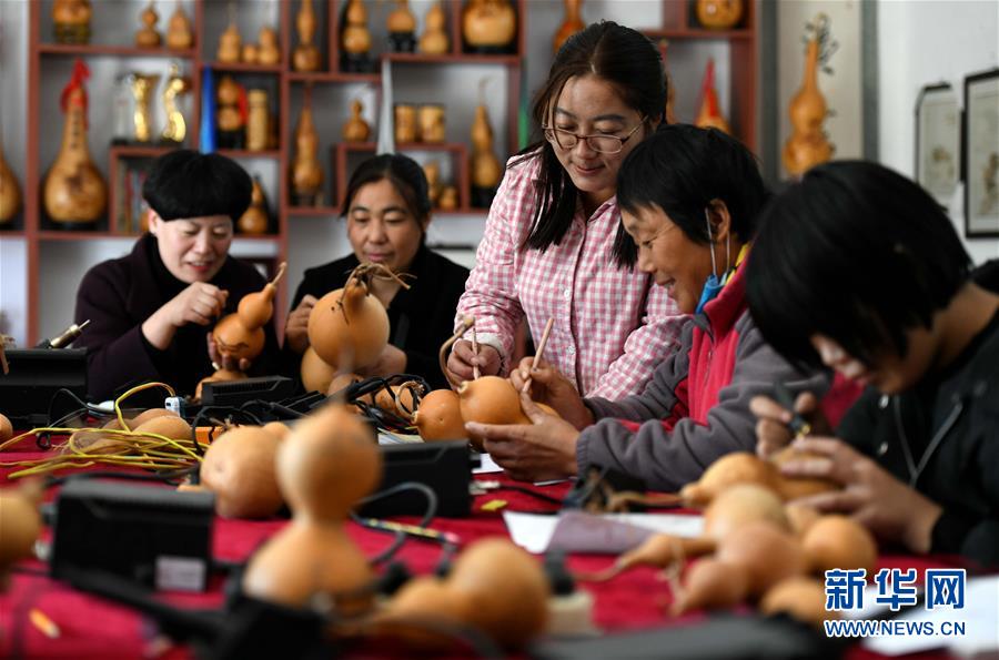 11月8日,在河北省石家庄市行唐县南桥镇葫芦烫画培训基地,当地妇女正在学习葫芦烫画技艺。 近年来,河北省石家庄市行唐县妇联强化妇女手工技能培训,通过实施“巧手创富工程”“巾帼扶贫车间”等项目,让农村妇女在家门口提升技能素质、掌握一技之长,助力贫困和留守妇女就业增收。 新华社发(许建园 摄)