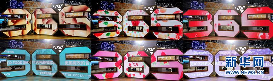 这是进博会食品及农产品展区内变换色彩的“6+365”主题灯箱(11月7日摄,拼版照片)。