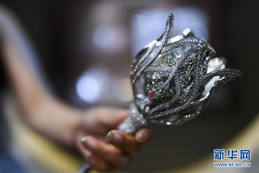 这是11月5日在进博会消费品展区钻石与宝石精品馆拍摄的钻石宝石权杖。新华社记者 李任滋 摄