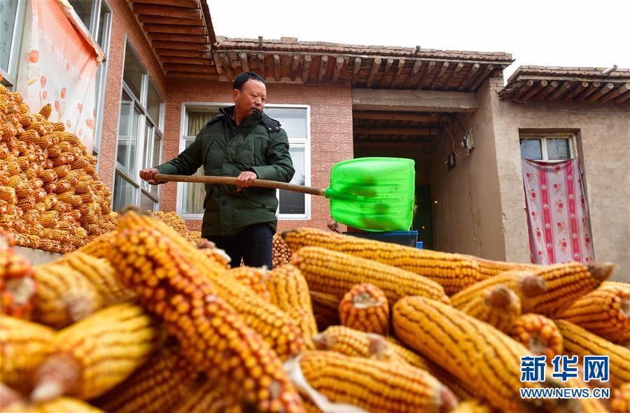 11月8日,在海东市民和回族土族自治县转导乡前坪村,村民在庭院里对玉米进行脱粒。 近日,青海省海东市民和回族土族自治县转导乡的三万亩全膜玉米进入收获季,农民利用晴好天气抓紧晾晒、脱粒、粉碎,制作青饲料,同时对收割后的田地进行覆膜保墒工作,田间地头一派繁忙景象。 新华社记者 张龙 摄