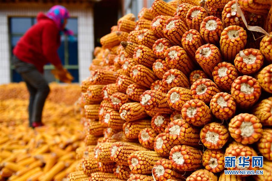 11月8日,在海东市民和回族土族自治县转导乡前坪村,村民在庭院里晾晒玉米。 近日,青海省海东市民和回族土族自治县转导乡的三万亩全膜玉米进入收获季,农民利用晴好天气抓紧晾晒、脱粒、粉碎,制作青饲料,同时对收割后的田地进行覆膜保墒工作,田间地头一派繁忙景象。 新华社记者 张龙 摄