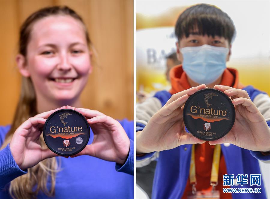 这是一张拼版照片,上图为10月20日,在位于新西兰小镇凯雷佩希的艾莱发喜新西兰公司,一名员工展示G'nature品牌冰激凌(新华社记者 郭磊 摄);下图为11月7日,工作人员在第三届进博会G'nature展台展示从新西兰进口的冰激凌(新华社记者 张玉薇 摄)。