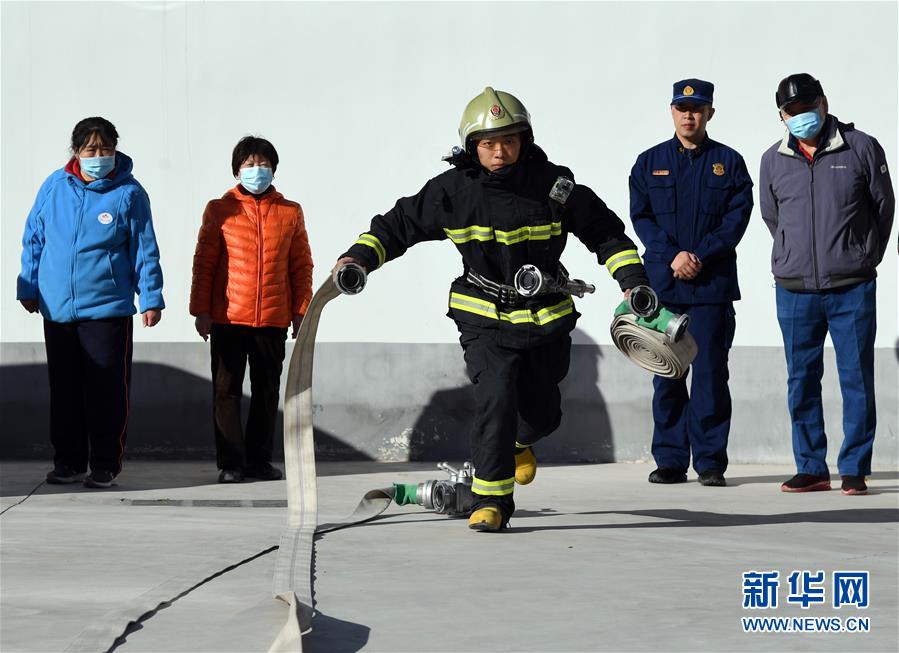 11月9日,在北京市海淀区永定路街道正大南路小型消防站,消防队员演示消防设备的使用。新华社记者 任超 摄