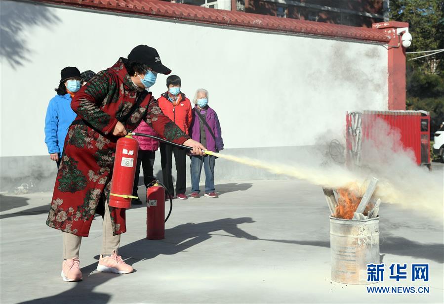 11月9日,在北京市海淀区永定路街道正大南路小型消防站,社区居民体验使用灭火器灭火。新华社记者 任超 摄