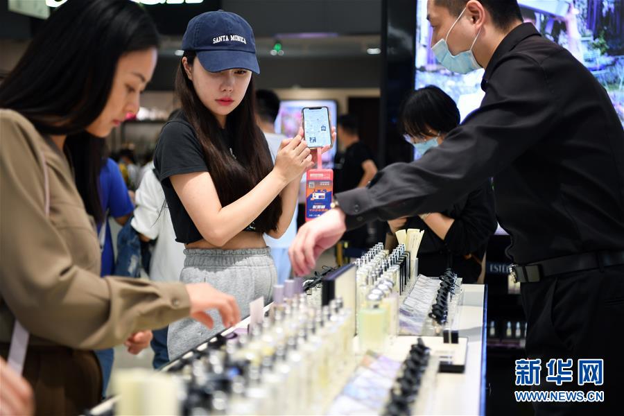 11月10日,消费者在海口日月广场免税店购物。 当日,记者从海口海关获悉,自2020年7月1日离岛免税新政实施以来至10月31日,海口海关共监管离岛免税销售金额120.1亿元,同比增长214.1%;购物人次178.3万人次,同比增长58.8%;购物件数1286.9万件,同比增长139.7%。 新华社记者 郭程 摄
