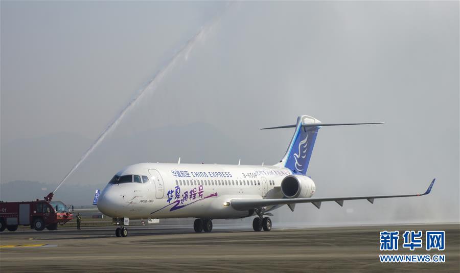 11月10日,在重庆江北国际机场停机坪上,中国商飞交付华夏航空的首架ARJ21飞机通过水门。 11月10日,中国商飞与华夏航空100架国产民机签约庆贺暨第一架ARJ21飞机交接仪式在重庆江北国际机场举行。这是华夏航空与中国商飞签订100架购机合同后,中国商飞交付的第一架民用客机。 新华社记者 刘潺 摄