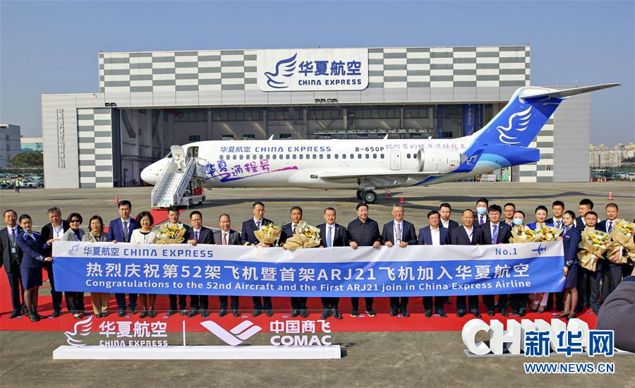 11月10日,在重庆江北国际机场停机坪上,嘉宾和执飞机组人员合影。 11月10日,中国商飞与华夏航空100架国产民机签约庆贺暨第一架ARJ21飞机交接仪式在重庆江北国际机场举行。这是华夏航空与中国商飞签订100架购机合同后,中国商飞交付的第一架民用客机。 新华社记者 刘潺 摄