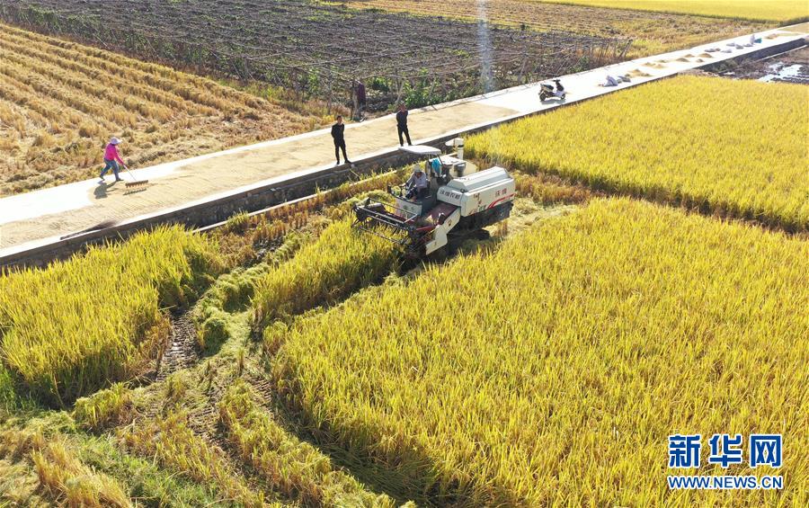 11月10日,在广西柳州市柳北区大仙村,农户驾驶收割机在稻田里收割富硒优质稻(无人机照片)。 时下,广西柳州市柳北区种植的富硒优质晚稻迎来收获期。柳北区引入种植专业合作社,采取“合作社+农户+基地+电商”模式组织280户脱贫户种植富硒优质稻700多亩,并将产品接入电商平台扶贫专区,为脱贫户拓宽了增收渠道。 新华社发(黎寒池 摄)