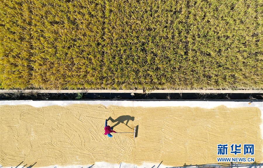 11月10日,在广西柳州市柳北区大仙村,农户在稻田边晾晒富硒优质稻(无人机照片)。 时下,广西柳州市柳北区种植的富硒优质晚稻迎来收获期。柳北区引入种植专业合作社,采取“合作社+农户+基地+电商”模式组织280户脱贫户种植富硒优质稻700多亩,并将产品接入电商平台扶贫专区,为脱贫户拓宽了增收渠道。 新华社发(黎寒池 摄)