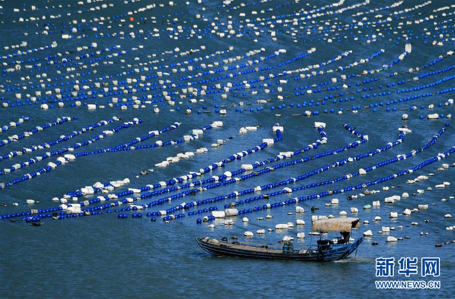 11月10日,一艘渔船行驶在养殖网箱和浮标之间。 当日,在福建省福州市连江县的“海上牧场”,渔民驾船穿梭在养殖网箱和浮标之间,呈现出一幅海上渔耕的壮美画卷。 新华社记者 魏培全 摄