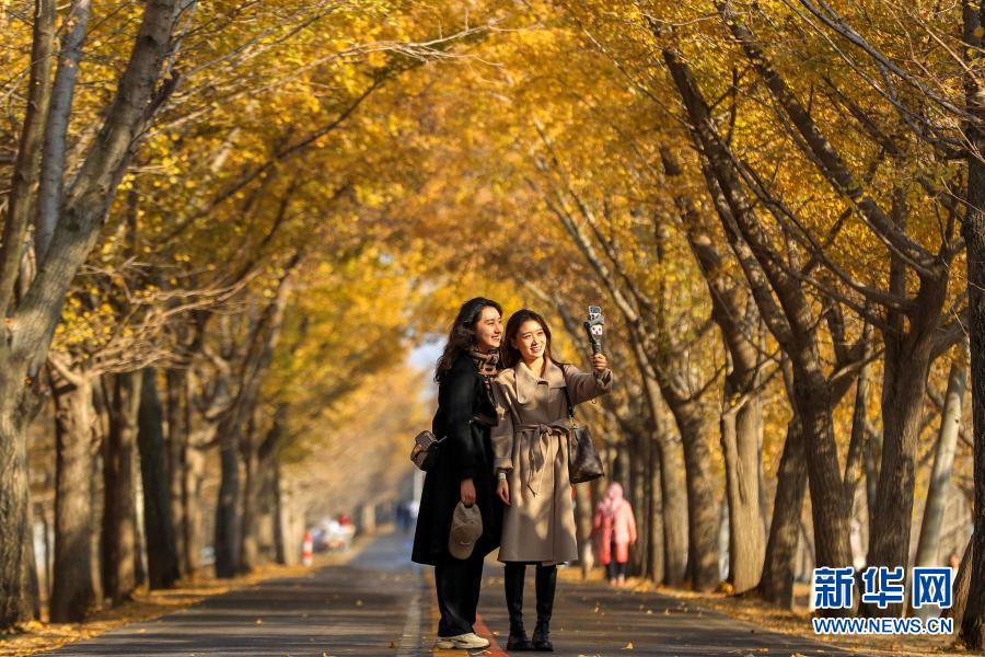 11月11日,游客在“银杏隧道”拍照留念。