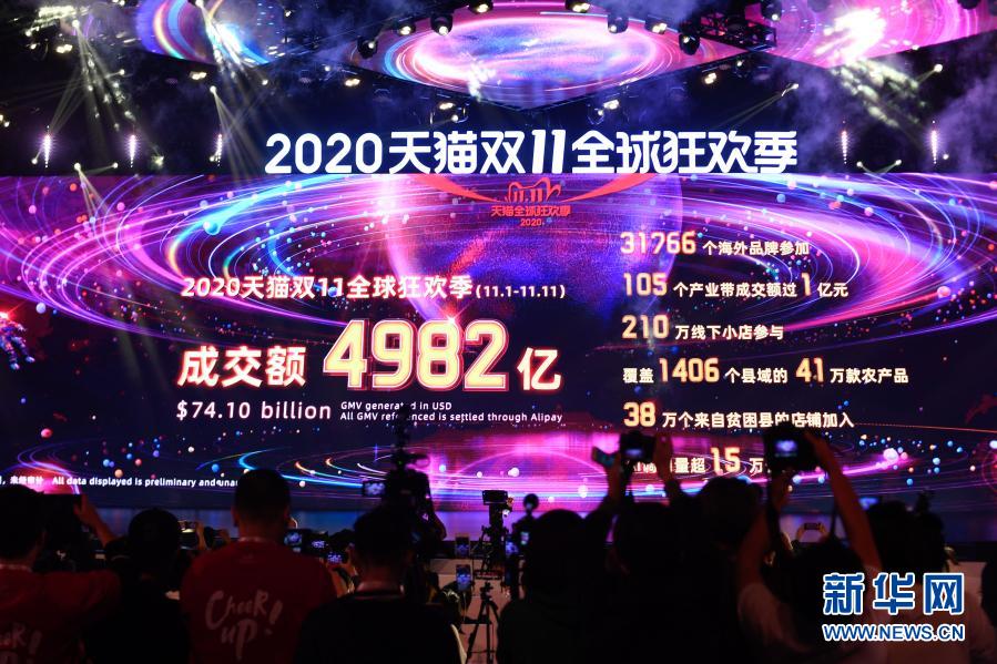 11月12日,在浙江杭州未来科技城学术交流中心,大屏幕显示阿里巴巴旗下天猫“双11”成交额超过4982亿元。2020天猫“双11”实时成交额数据超过4982亿元人民币。新华社记者 黄宗治 摄