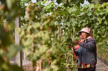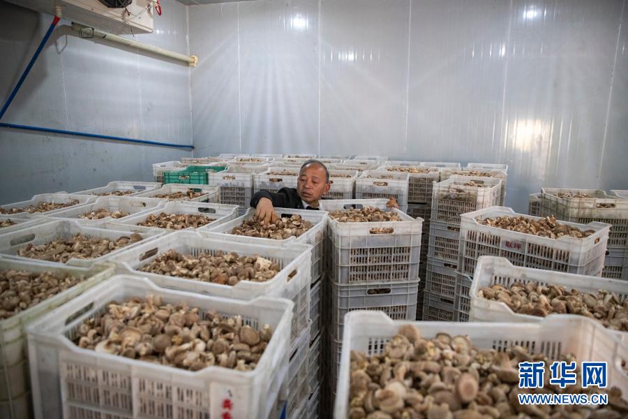 11月11日,在城口县沿河乡联坪村,村主任彭远寿在冷藏库房查看采摘的鲜菇。2017年以来,重庆市城口县沿河乡联坪村以“村集体+公司(合作社)+农户”的模式,大力发展食用菌产业,带动137人在家门口实现就业,让村民实现了稳定脱贫、持续增收。新华社记者 黄伟 摄