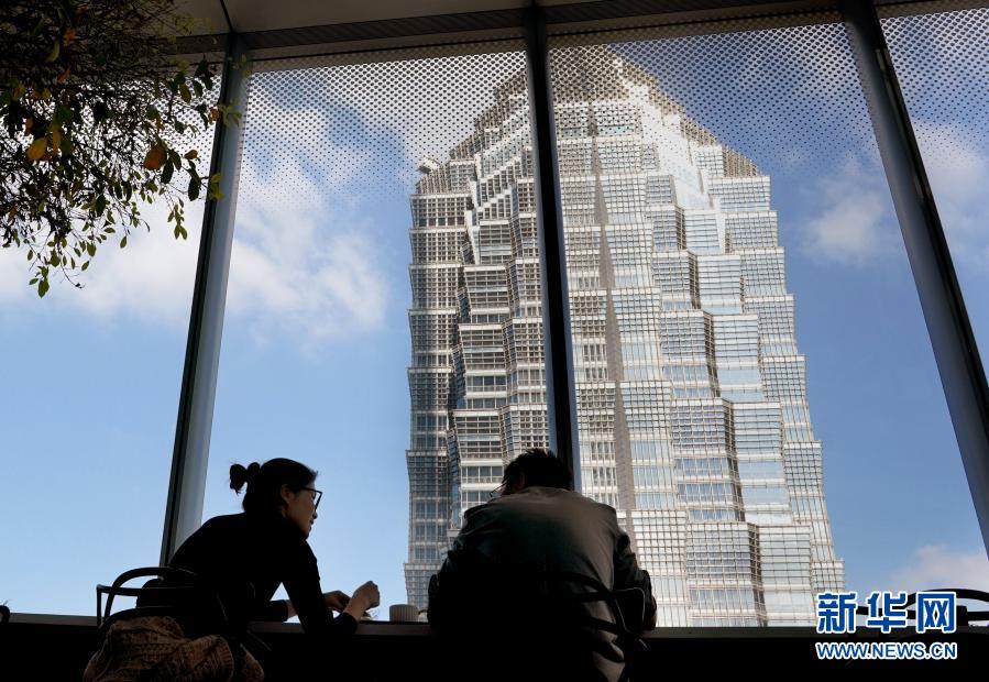 11月12日,顾客在上海中心52层朵云书院的咖啡座上聊天。新华社记者 刘颖 摄