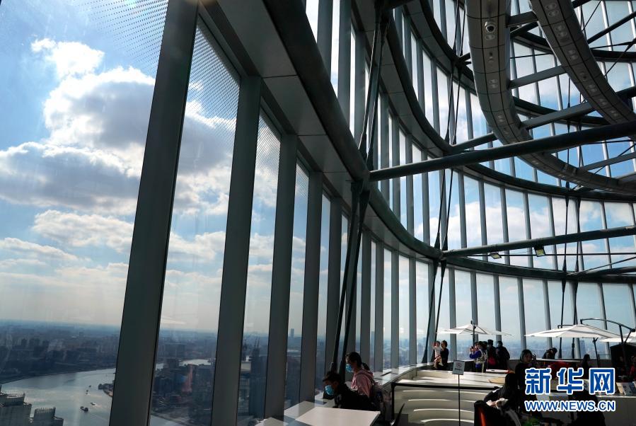 11月12日,顾客在上海中心52层的朵云书院眺望窗外景色。新华社记者 刘颖 摄