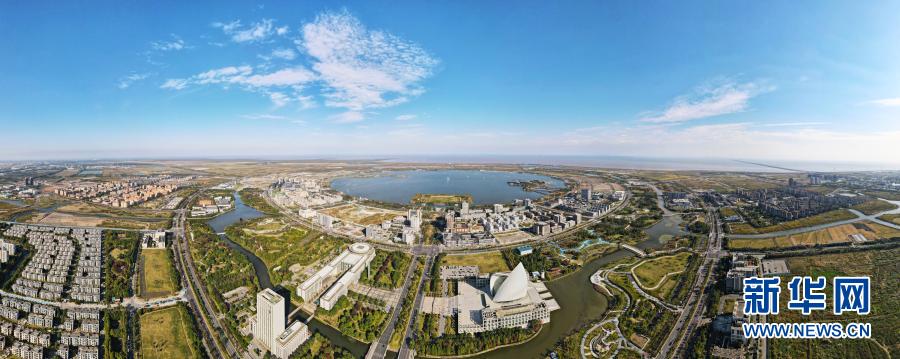 10月25日拍摄的上海临港新城滴水湖畔(无人机全景照片)。新华社记者 方喆 摄