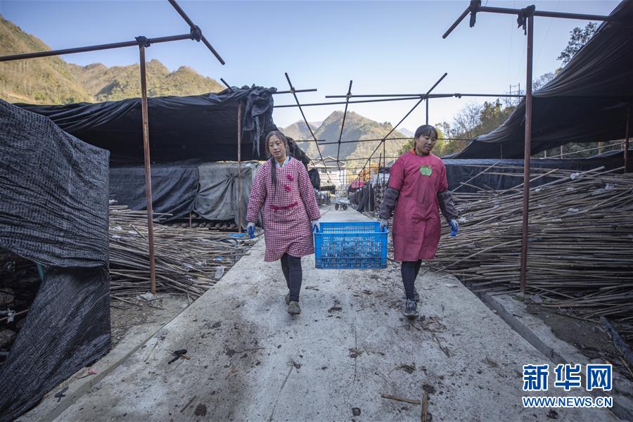 11月12日,在城口县修齐镇花菇扶贫产业基地,村民在搬运采摘的花菇。 重庆市城口县地处秦巴山区连片特困地区。近年来,城口县修齐镇积极发展花菇产业,以“公司+基地+集体+贫困户”的模式,带动周边乡镇的农户发展家庭农场,推动农户脱贫增收,助推乡村振兴。 新华社记者 黄伟 摄