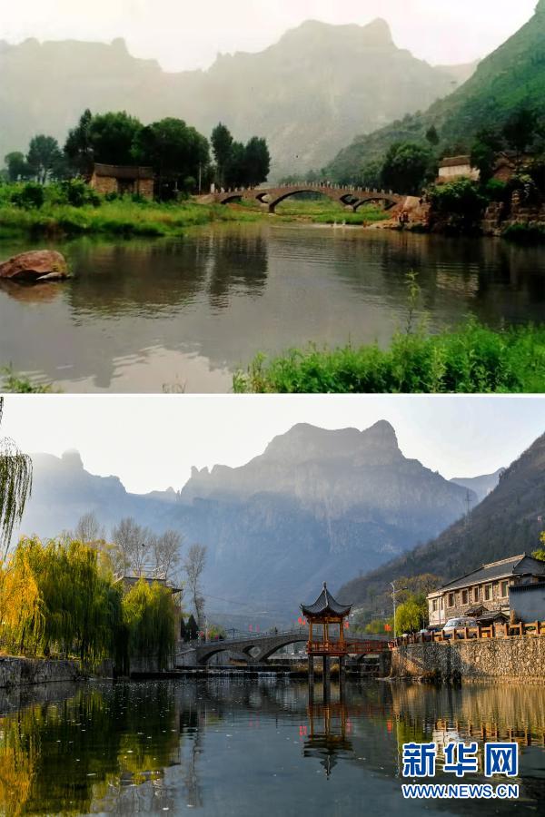 这是一张拼版照片,上图为:山西省平顺县虹霓村旧景(资料照片);下图为:11月11日拍摄的虹霓村景色(无人机照片,新华社记者曹阳摄)。