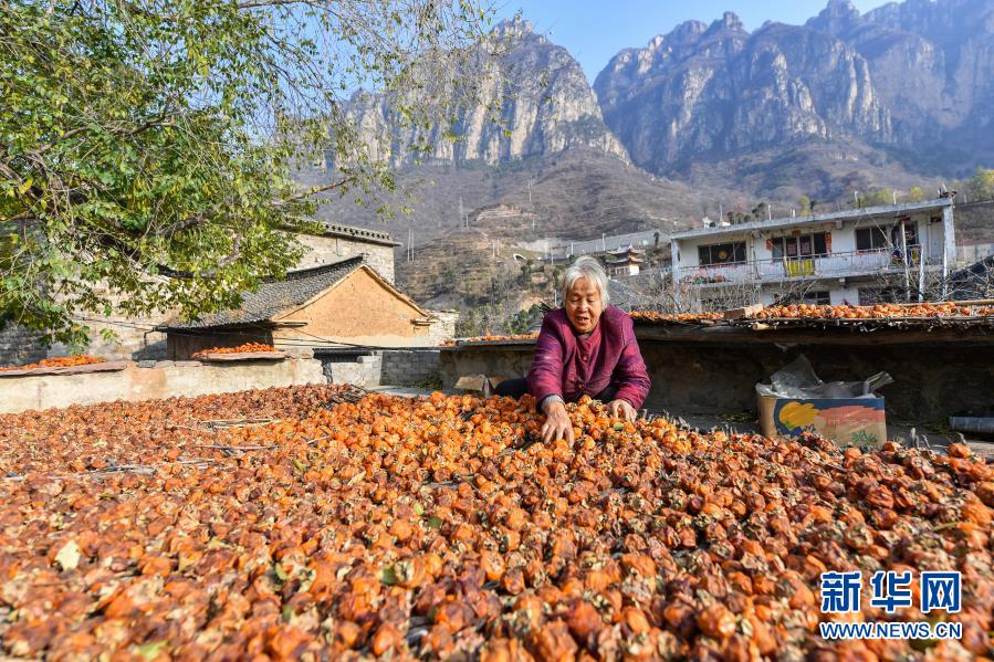 11月11日,山西省平顺县虹霓村的脱贫户在整理晾晒的柿子。