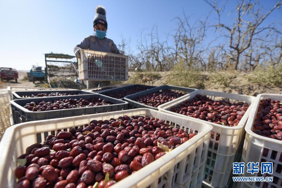 在和田县吾宗肖乡汉族队村,枣农在搬运收获的红枣(11月6日摄)。