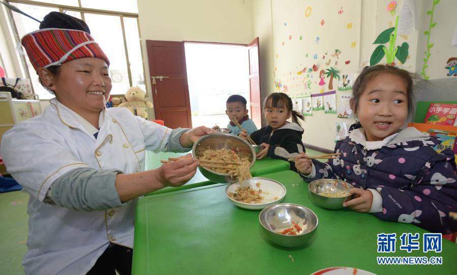 11月13日,在贵州省剑河县革东镇东南村新建的幼儿园,学生在吃午餐。新华社记者 杨楹 摄