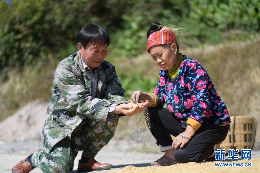 11月13日,在贵州省剑河县革东镇东南村,驻村第一书记钟传坤(左)在了解一村民家的粮食收成情况。新华社记者 杨楹 摄