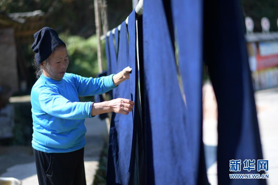 11月13日,在贵州省剑河县革东镇东南村,村民在晾晒染布。新华社记者 杨楹 摄
