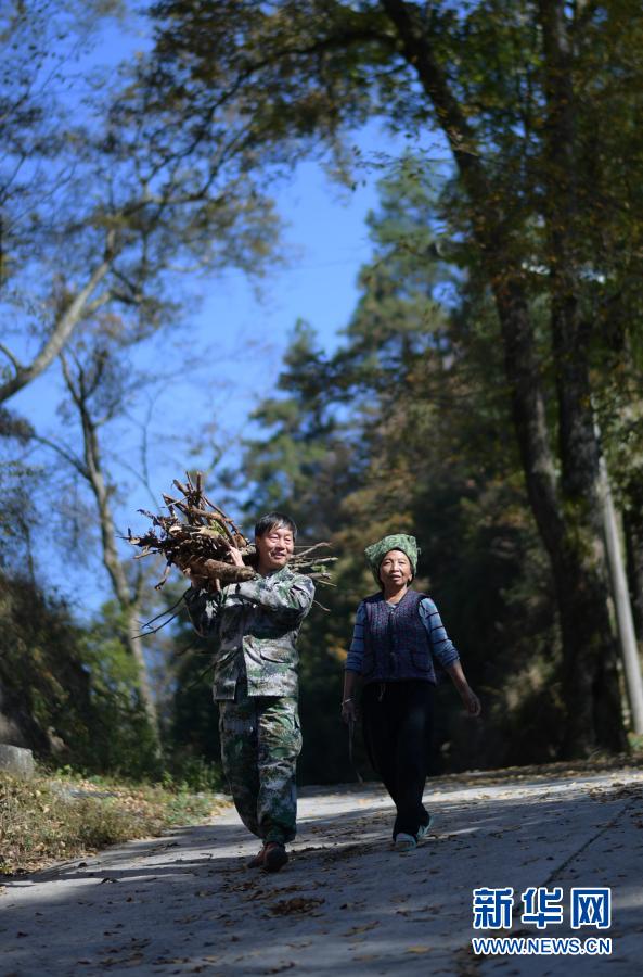 11月13日,在贵州省剑河县革东镇东南村,驻村第一书记钟传坤(左)和村民走在回村的途中。新华社记者 杨楹 摄