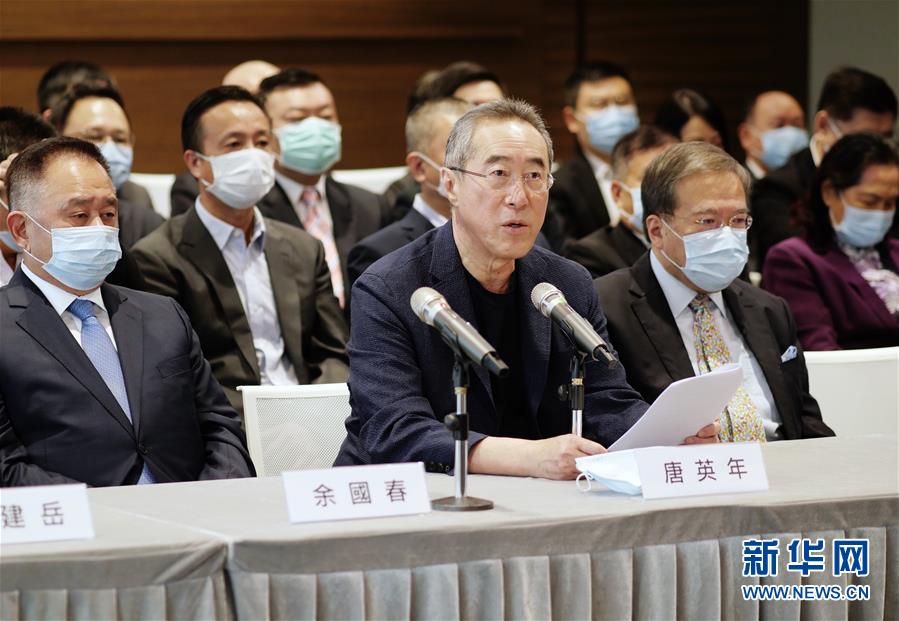 11月13日,在香港中环广场,全国政协常委、香港友好协进会会长唐英年(中)与多位港区全国政协委员举行新闻发布会,表示坚决拥护和支持全国人大常委会就香港立法会议员资格问题作出的决定。新华社记者 王申 摄